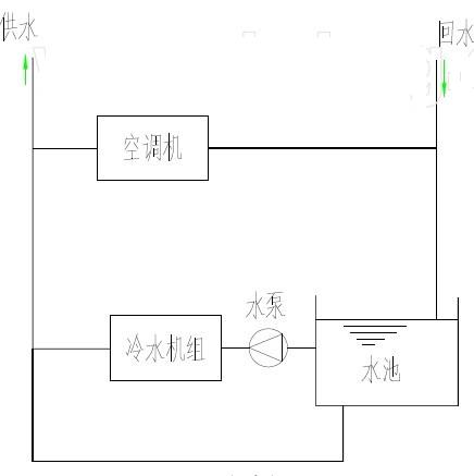 如圖1,為一水池蓄冷系統(tǒng)簡圖,在利用水池冷水供冷時(shí),水泵要克服從水池吸入點(diǎn)到系統(tǒng)的水柱壓力,此外還要克服左側(cè)部分水路的管件、管路、冷水機(jī)組以及末端設(shè)備阻力。這樣泵的揚(yáng)程為上述阻力與水柱壓力之和。