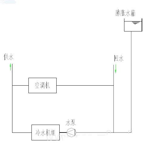 如圖2,為典型膨脹水箱定壓空調(diào)冷凍水系統(tǒng)簡圖,水在膨脹水箱處是與空氣接觸的,對系統(tǒng)腐蝕是不利的。但該系統(tǒng)是一個(gè)閉式系統(tǒng)。因?yàn)橛覀?cè)水柱壓力與左側(cè)水柱壓力互相抵消,水泵運(yùn)行時(shí)不需要克服水柱的勢能,只要克服系統(tǒng)(左側(cè)部分與右側(cè)部分)水路的管件、管路、冷水機(jī)組以及末端設(shè)備阻力,所以樓高、樓正、樓歪影響不大。這樣泵的揚(yáng)程為上述阻力之和。