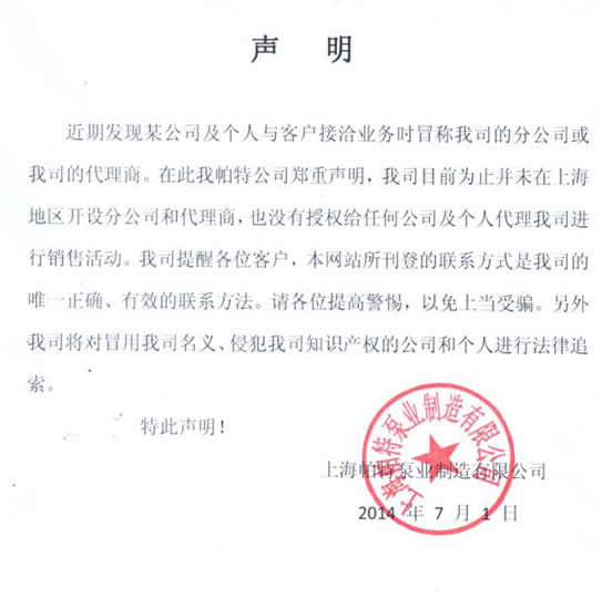 近期發(fā)現(xiàn)某公司及個人與客戶接洽業(yè)務(wù)時冒稱我司的分公司或我司的代理商。在此我帕特公司鄭重聲明,我司目前為止并未在上海地區(qū)開設(shè)分公司和代理商,也沒有授權(quán)給任何公司及個人代理我司進行銷售活動。我司提醒各位客戶,本網(wǎng)站所刊登的聯(lián)系方式是我司的唯一正確、有效的聯(lián)系方法。請各位提高警惕,以免上當(dāng)受騙。另外我司將對冒用我司名義、侵犯我司知識產(chǎn)權(quán)的公司和個人進行法律追索。