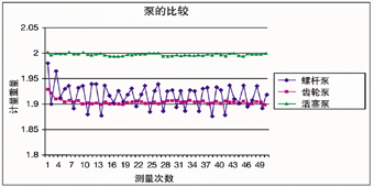 圖1.三種類型的泵的比較。計(jì)量的物質(zhì)為多羥基化合物,密度大約1.6g/cm3,粘度大約為15,000mPas。